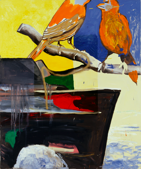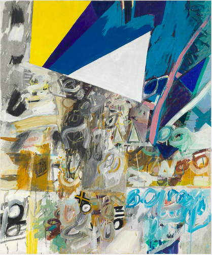 On close observation the gestural expanse is composed of rectangles of hand’s width sized marks resembling a scrawling handwriting in greys, ochres, whites and one rectangle in the lower right mainly in blues that pulls the eye down in a cascade from top to bottom. Squinting at the painting, similar to the Sansom painting I discussed last time, the stabbing black chunks punch holes in the surface and give tension and spatial definition to the murkier indistinct scrawling blather. With easy humour that challenges abstract expressionism’s claims to the sublime this dynamic gives articulation to something inchoate and absurd. The one element that completes and adds greater complexity to the chromatic and spatial world is the pinkish brushstroke running from top right to midway. This is echoed with a similar angled white line tucking behind a gestural moment and delving into a dark aperture. Directing this play of forces is the massive intrusion of hard edge wedges of industrial lemon yellow, white and warm ultramarine and cooler teal blues painted toughly yet with give at the top of the canvas. This is a wonderful play on one of the cornerstones of creating space in Western painting- the misty background of a Titian or the Mona Lisa cut over with a more sharply defined figure – here unsettled and topsy turvy.