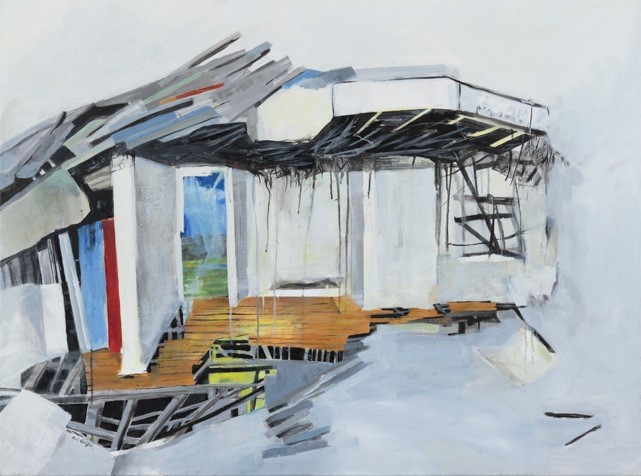 Paintings that describe fragmented domestic spaces populated with disintegrating walls, are timely. They come when the industrial spaces around Rosi Griffin’s Collingwood studio are rapidly transforming with new developments continually springing up for a swelling inner city population. They come at a time when massive rises in Australian house prices have turned property development and residential renovation into a national sport when glossy magazine style layouts of idealised domestic spaces cloud our image of that the home has been for most of us.