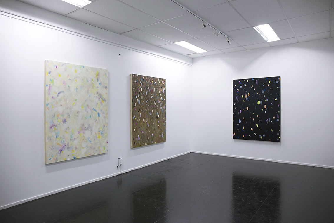 Adrian’s abstract work comprises  hovering planes of coloured marks on a consistent pale, or dark, or umber background. The marks vary in size and slightly in tone, diffusing beneath layers of thin paint, therefore creating several planes. Despite being on a flat, consistent background, the marks drift off into pockets of infinity. Like little galaxies or the infinite suggested by certain repetitive patterns. These paintings aspire for a greater harmony, a greater resolution, a sense that there is or could be an infinite. The colours Adrain uses are slightly cool and acid, slightly sour yellows and greens, supported by pastels and more mellow cool colours. The colour combinations are fresh enough to keep the whole project interesting yet still harmonise. Abstraction at this end of its historical passage is difficult to do well and Adrian passes it off successfully.