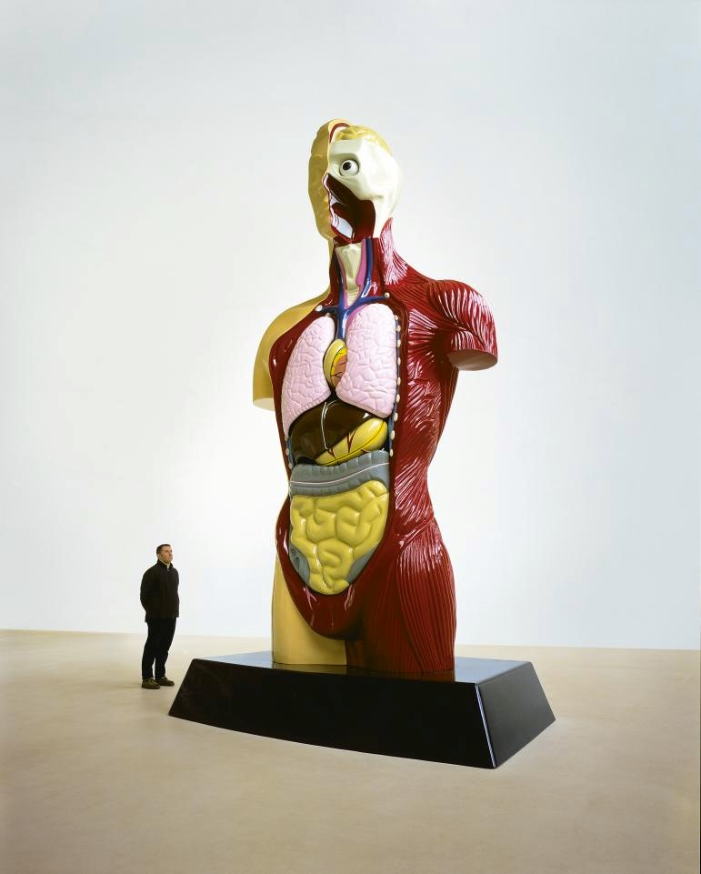 Damien Hirst’s Hymn (1999), is an exact replica of Humbrol Limited’s Young Scientist Anatomy Set. The toy sold for only £14.99 while Hirst’s sculpture sold for one million pounds. Hirst has magnified the scale of the toy to a sculpture of about six metres tall and changed the materials from plastic to bronze, gold and silver. Hirst has also altered the art piece’s context from a medical toy to its placement in the contemporary art gallery. His minimal change of the original toy design resulted in a court case accusing him of plagiarising. Hirst was found guilty and was ordered to pay a settlement for his appropriation.