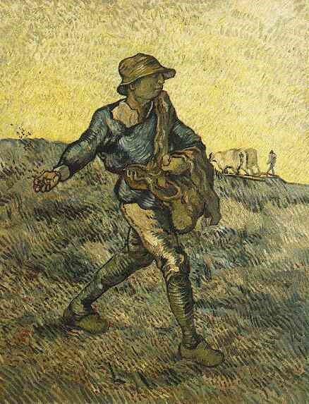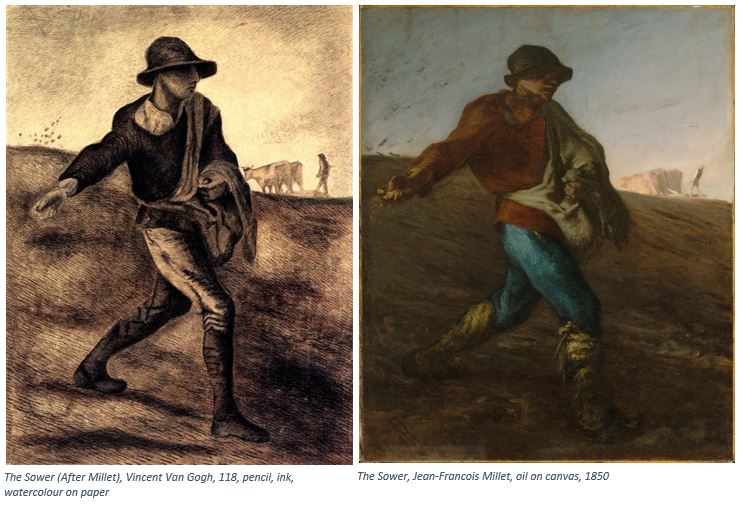 Van Gogh began studying Millet’s work and produced drawings in order to learn how to paint. He drew The Sower (after Millet), pictured below, which was based on a black and white print of the painting. Van Gogh’s interpretation of the monochrome reproduction led to some interesting, minor inconsistencies; the grains that Van Gogh’s sower is scattering behind him were actually birds in Millet’s work.